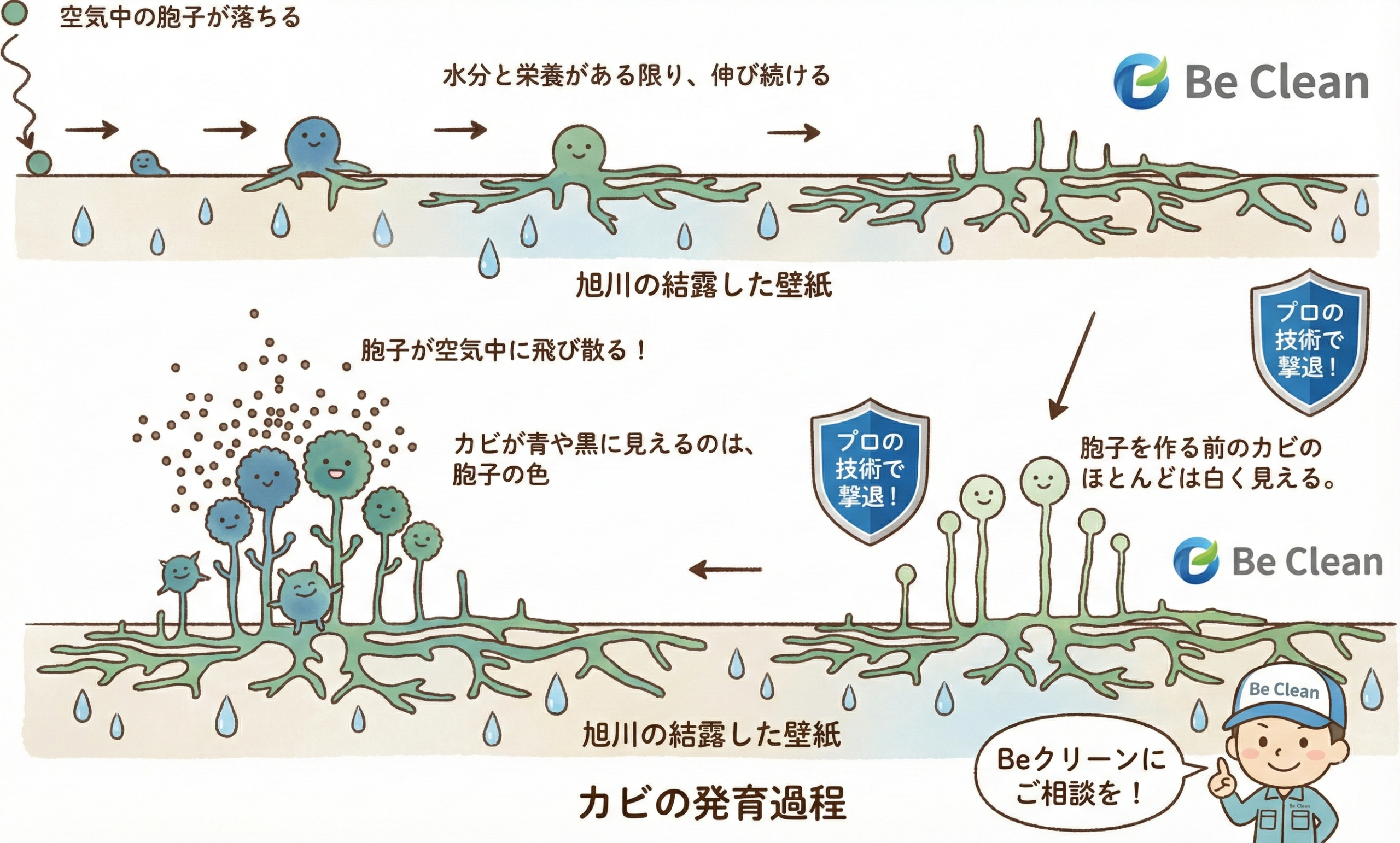 Beクリーンが提供するカビ対策は、市販のカビ取り剤でお掃除するだけのサービスではありません。 「化学」と「建築」の知識を組み合わせて解決します。